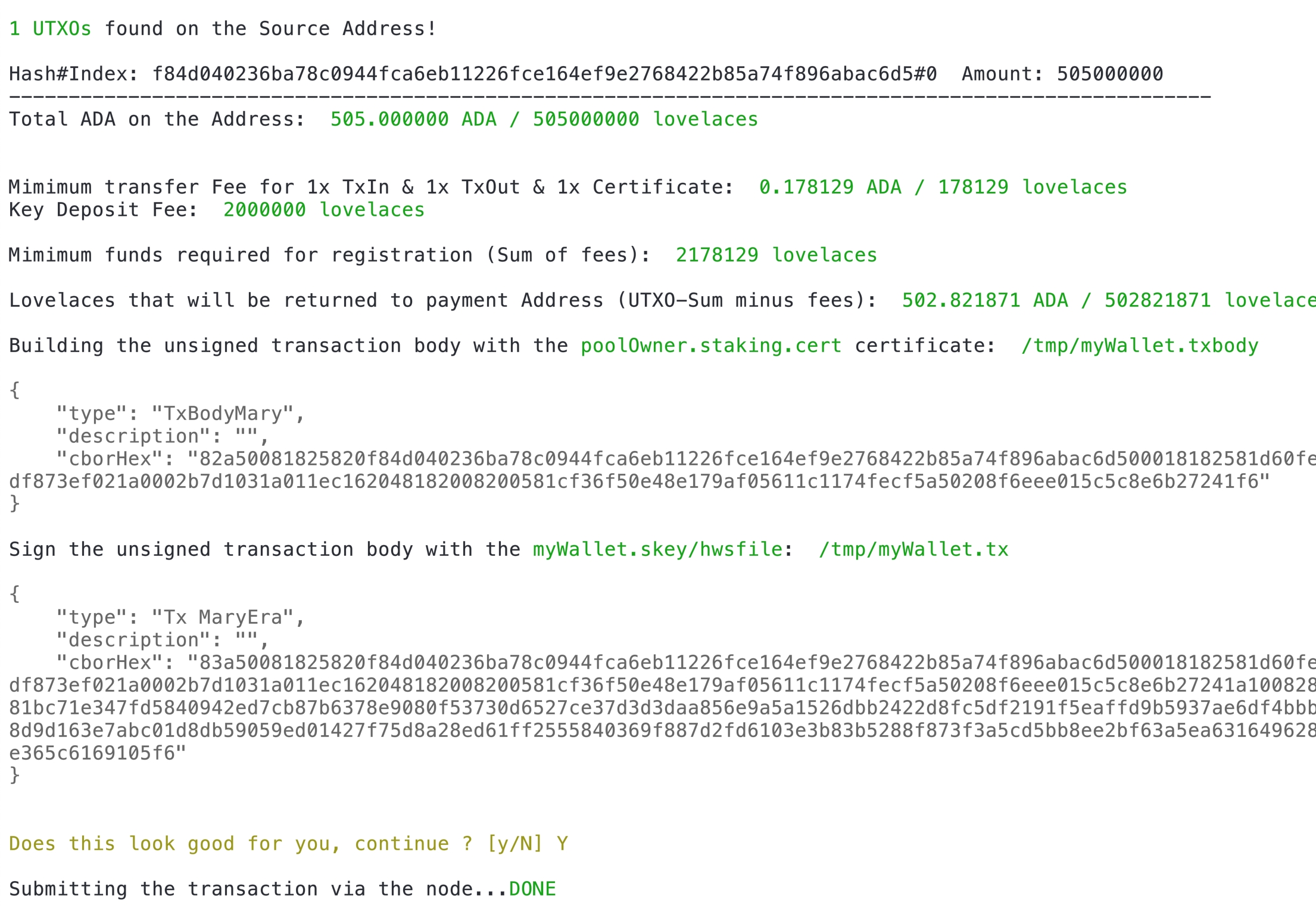 Great, now let's register the owner stake key on the blockchain, myWallet will pay for the transaction as well as for the deposit