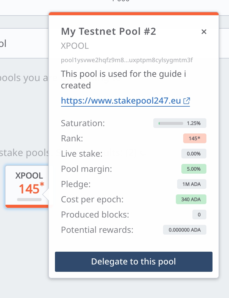 short and long descriptions: "My Testnet Pool #2", "This pool is used for the guide i created",
