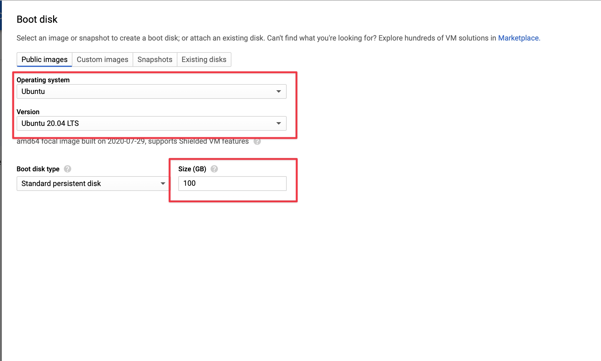 Let's go for Ubuntu 20.04 LTS with 100GB disk space: