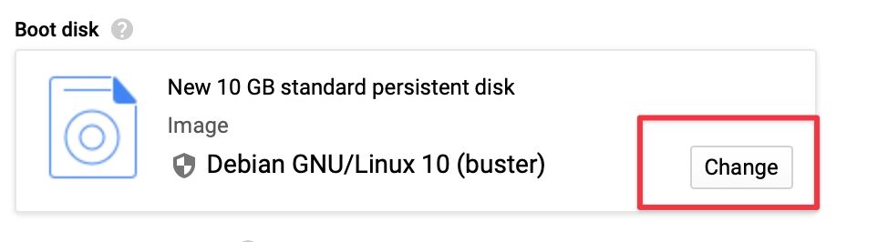 Now let's choose Linux flavor and boot disk size, click on the "Change" button: