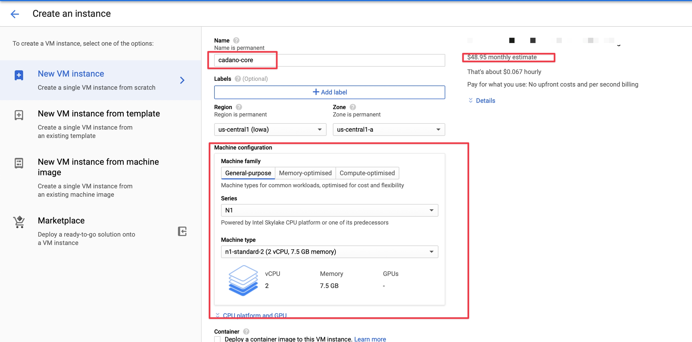 Let's edit the Machine configuration: choose N1 Server: 2vCPU server with 7,5GB RAM (this will cost us ~49USD per month)